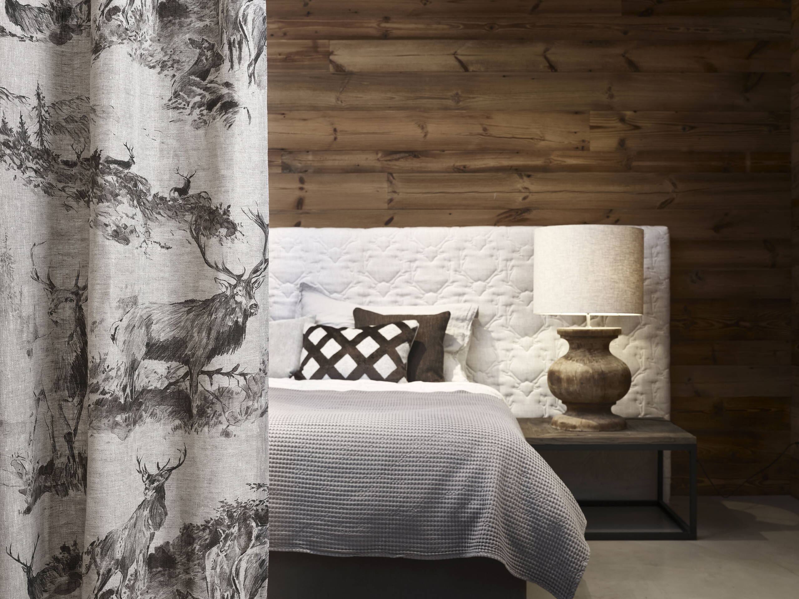 Der Mountain Deluxe Vorhang von Fine holt die majestätische Schönheit der Alpen in Dein Schlafzimmer. Mit sorgfältig gewebten Motiven und einem Hauch von Rustikalität, ist er die perfekte Wahl.