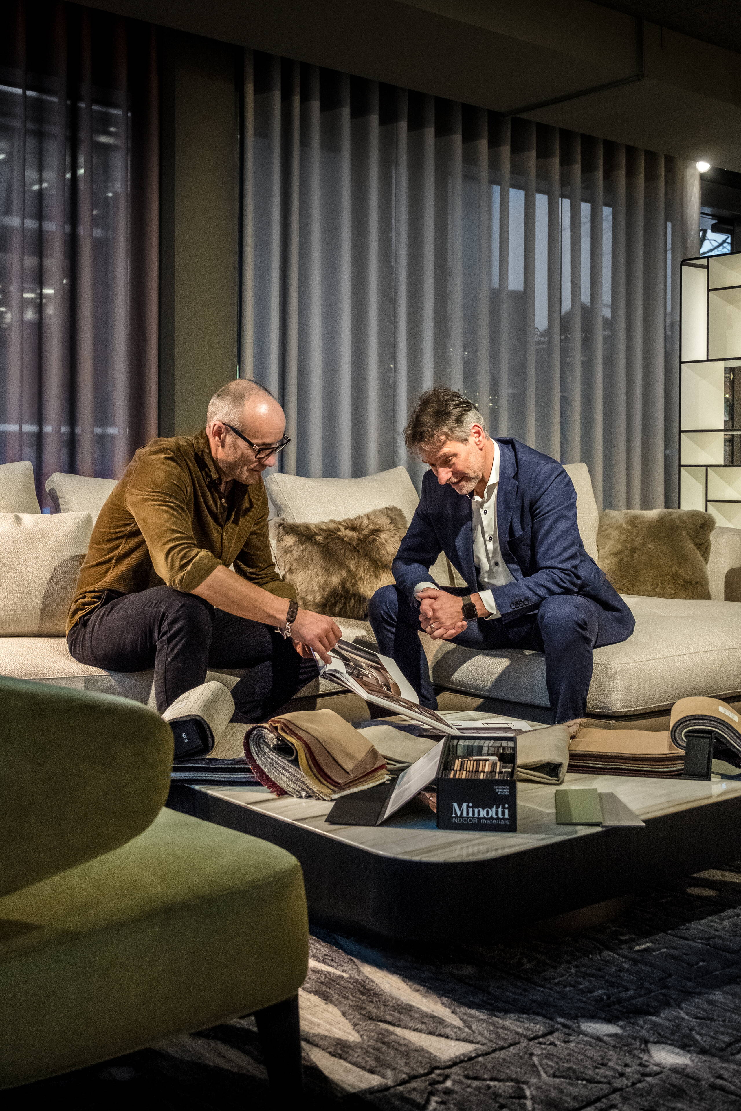 Sobald das Konzept steht, sitzen auch die Kunden wieder mit an den Tisch. Jetzt wirds konkret. In der Ausstellung werden die infrage kommenden Möbel besichtigt und natürlich getestet. Probesitzen, verschiedene Farben und Stoffe prüfen – für das Griwa-Team ist der Job erst erledigt, wenn jede Einzelheit zusammenpasst.
