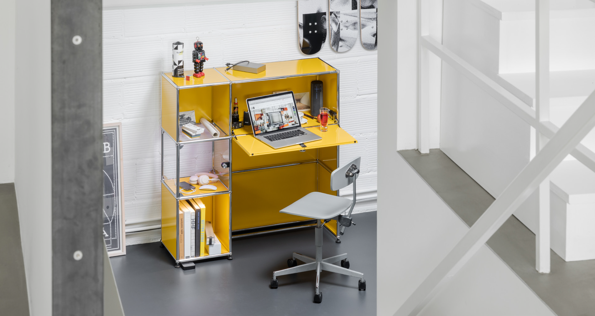 Die Desinfektionseinheit UV-C bietet eine in das bestehende USM Haller Möbelbausystem integrierte Lösung, um Gegenstände zu desinfizieren. In der Desinfektionseinheit sind vier e-Leuchten UV-C und ein e-Türschalter UV-C als neue Teile eingebaut. Eine e-Leuchte UV-C ist jeweils mit drei UV-CLEDs und zwei Indikatorleuchten ausgestattet. Der e-Türschalter ist zusätzlich mit einem Reed-Relais bestückt, welches mit einem Magnet im Türgriff das Starten und Beenden des Desinfektionsprozesses steuert.