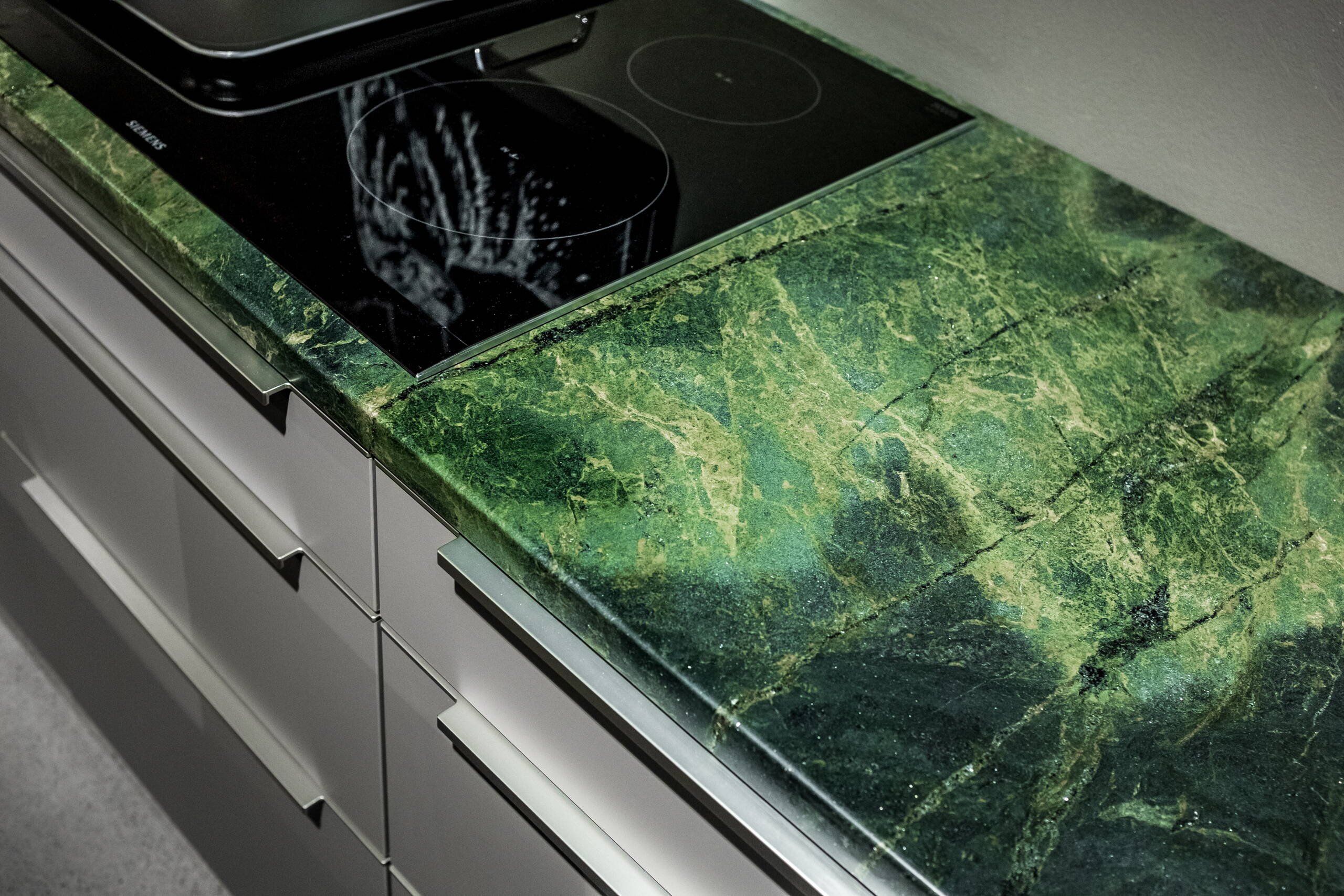 in Kunststoff Lavagrau matt, Korpusfarbe aussen Kaschmir, mit Griffleiste in Edelstahloptik, Arbeitsplattenhöhe 910 mm, Sockelhöhe 100 mm, Granitabdeckung 30 mm Golden Green Tundra